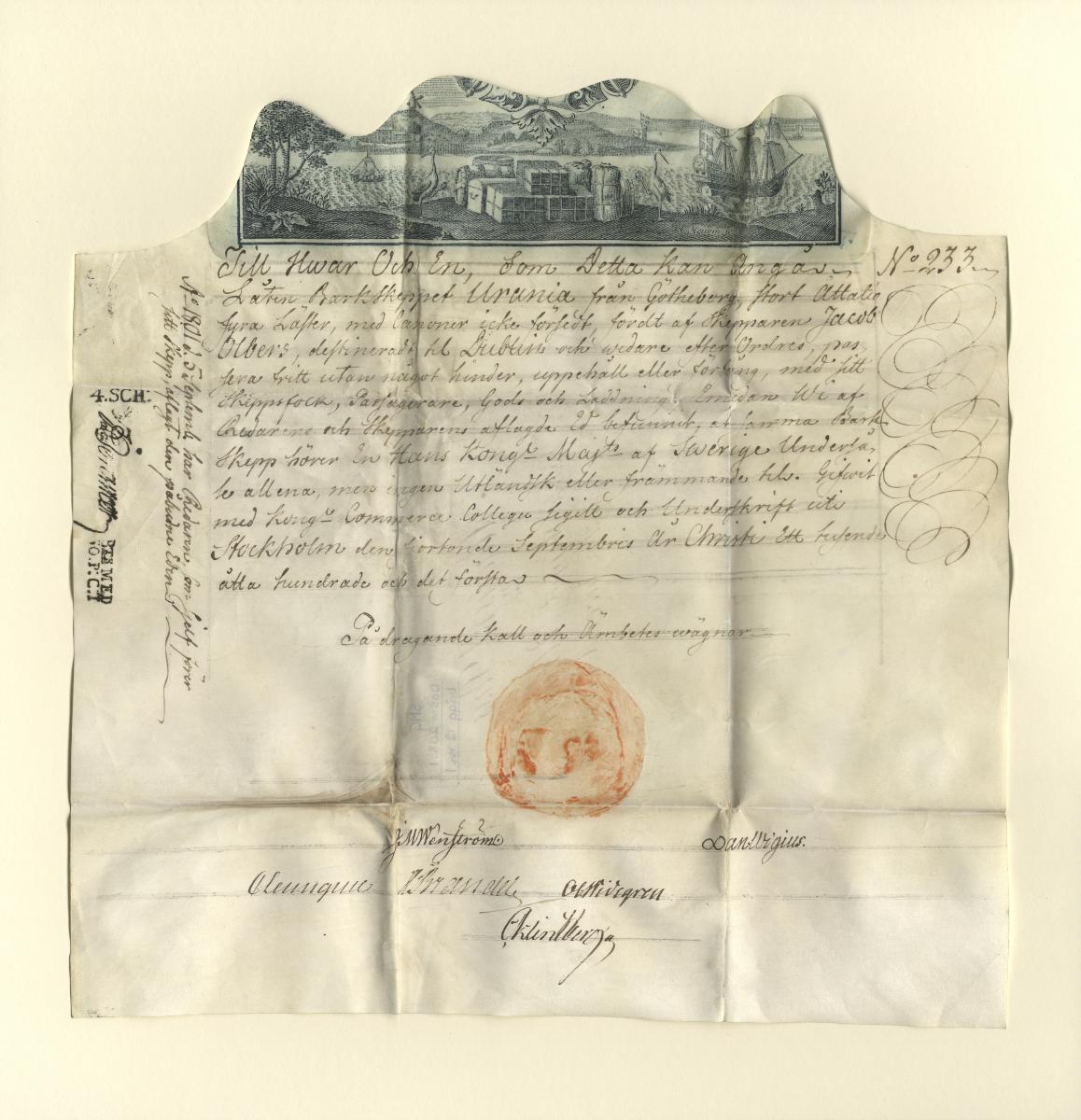 Algeriskt sjöpass för barken URANIA under kapten Jacob Olbers för resa från Göteborg till Dublin och vidare. Nr 233 år 1801 utfärdat av Kommerskollegium.