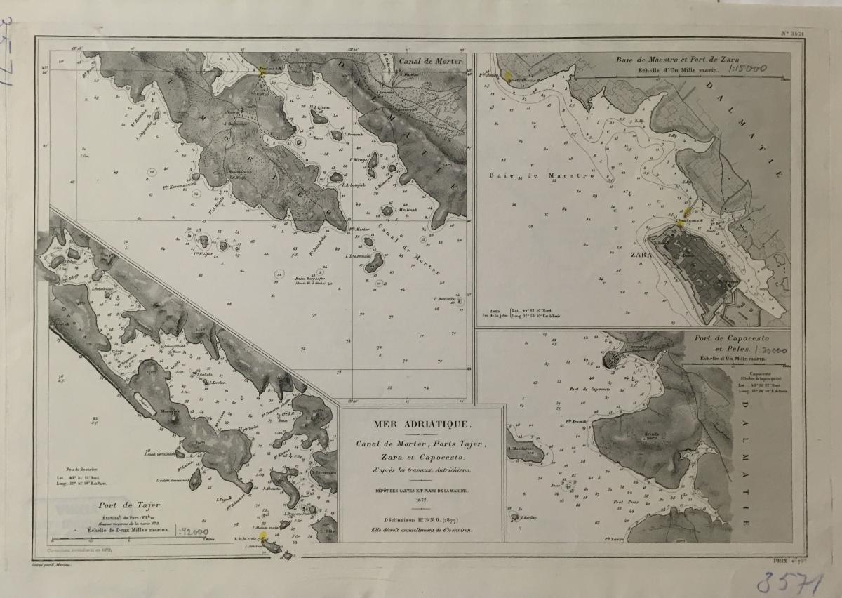 Sjökort, Italien 1877. På franska 'Mer Adriatique, Canal de Morter, Ports Tajer, Zara, et Capocesto '