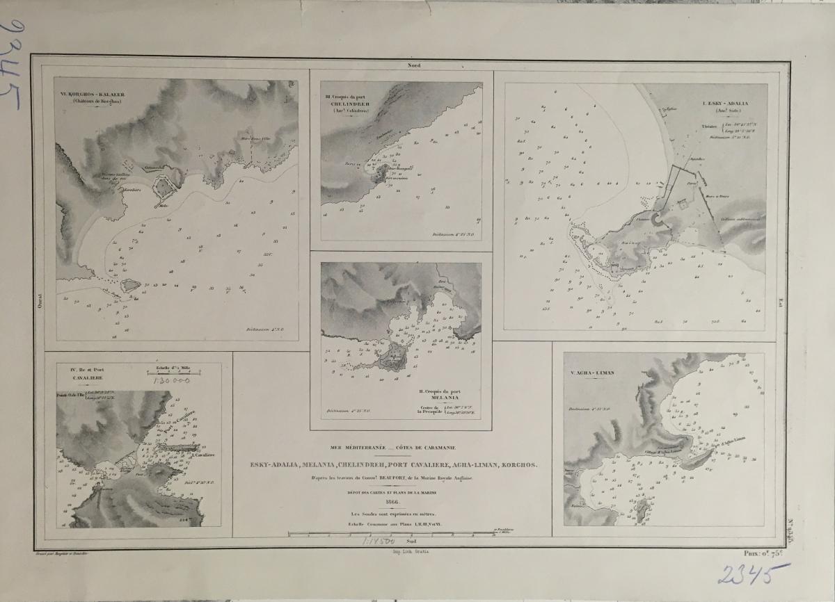 Sjökort, Grekland och Turkiet 1866. På franska 'Esky-Adalia, Melania, Chelindreh, Port Cavaliere, Agha-Liman, Korghos'