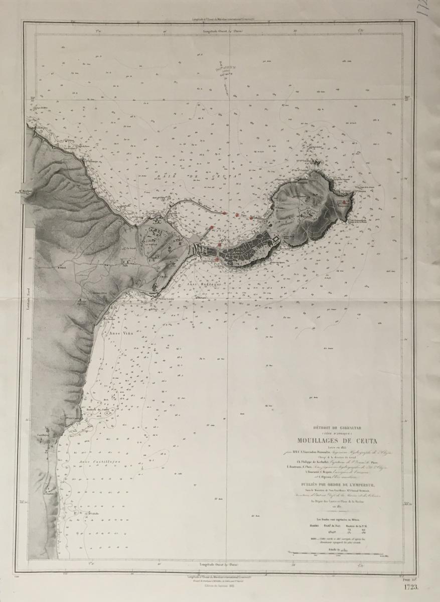 Gå tillbaka till sökLägg till i Min samlingKopiera länkSkriv utSjökort, Mouillages de Ceuta, GibraltaAktörerKungliga Sjökarteverket, Förvärvat frånKategoriSjökort (Karta)Datering1857GeografiSpanien (Europa) Europa Storbritannien (Europa)Material och teknikpapper, bläck, tryckInventarienummerSMG47020UtställdInte utställd på museetBeskrivningSjökort, Gibralta 1857. På franska 'Mouillages de Ceuta, Gibralta'