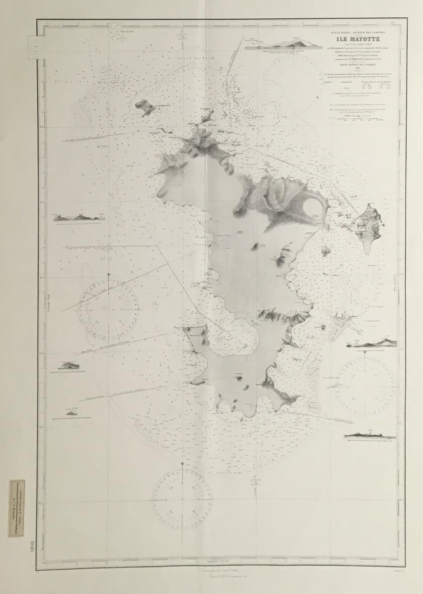 Sjökort, Indiska oceanen 1845. På franska 'Ile Mayotte, Archipel des Comores'