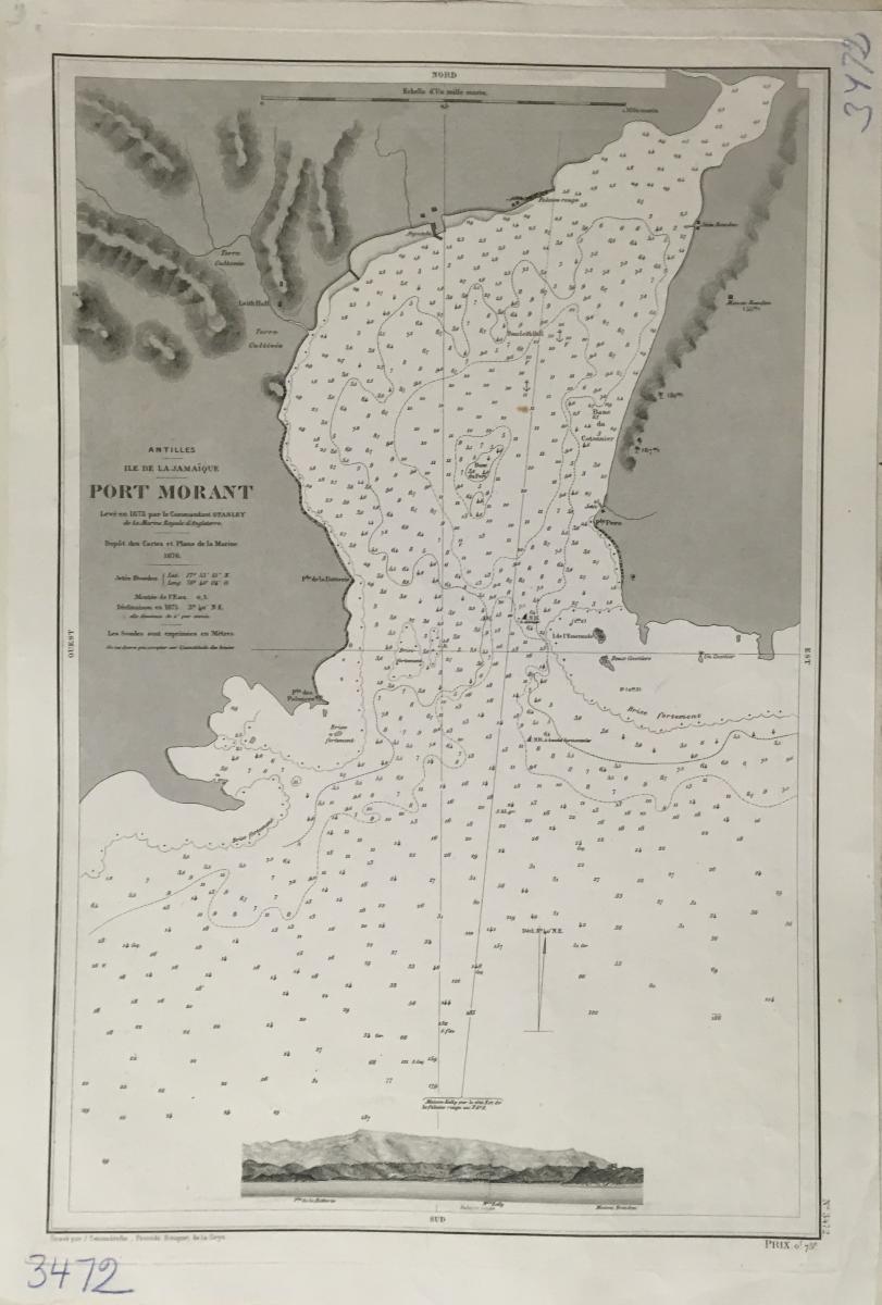 Sjökort, Antilles, Västindien 1876. På franska 'Ile de Jamaique, Port Morant'