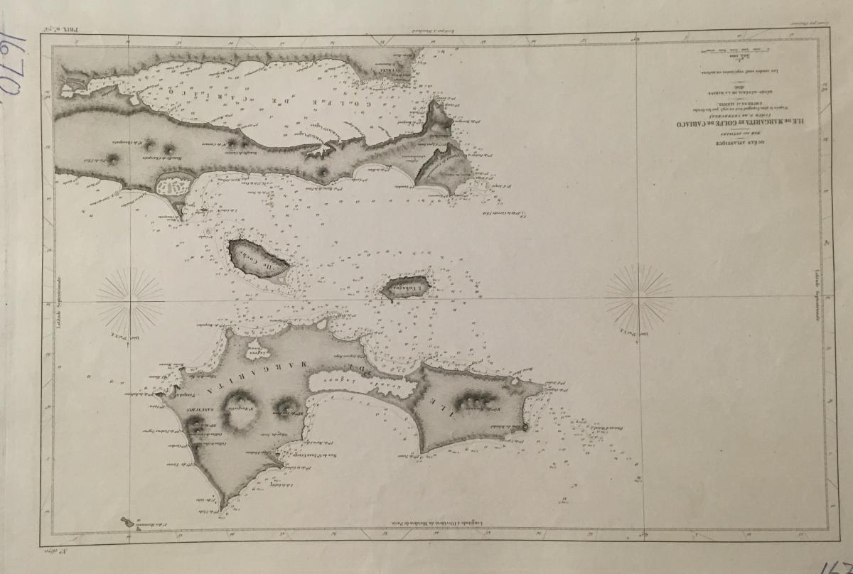 Sjökort, Antilles, Västindien 1856. På franska 'Ile de Margarita et Golfe de Cariaco'