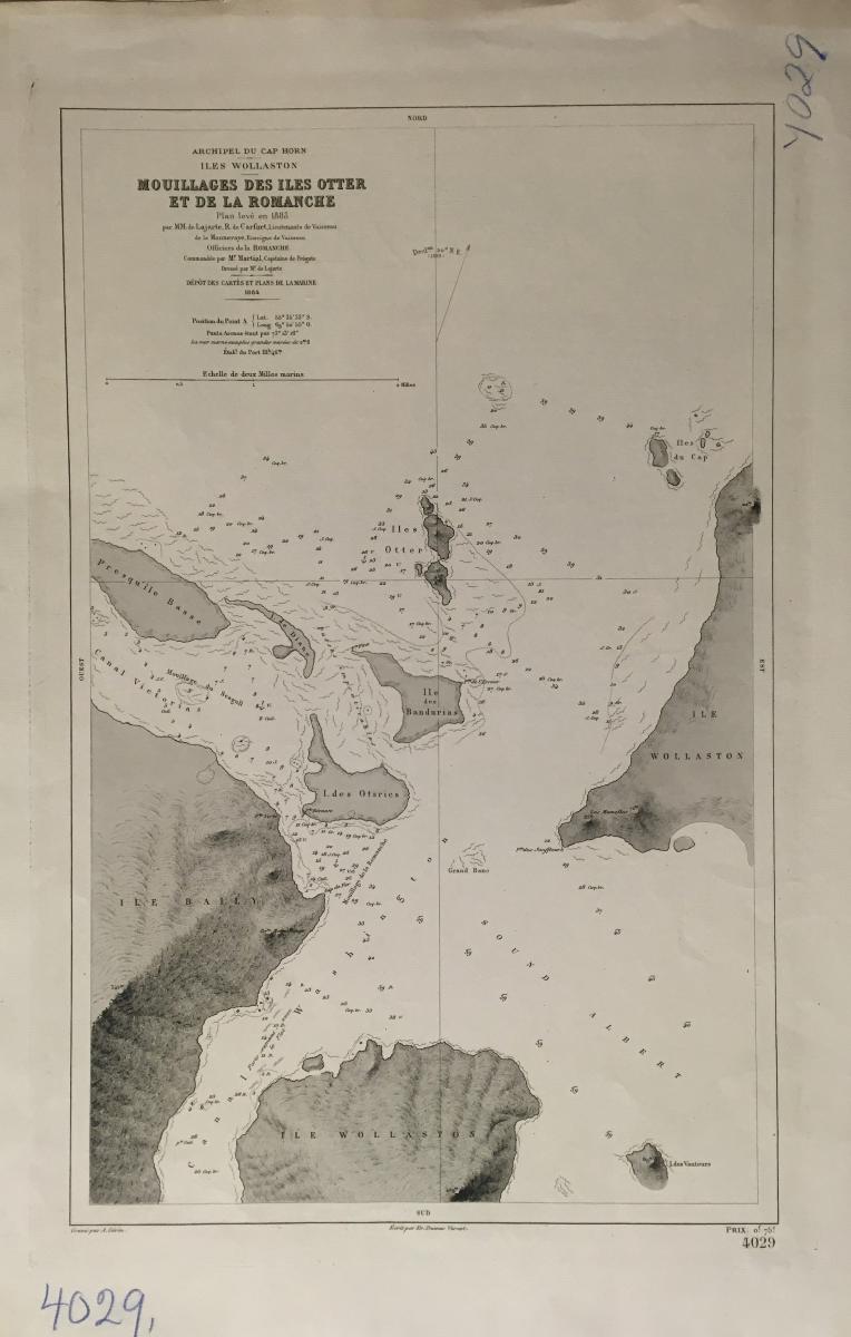 Sjökort, Kap Horn, Chile 1884. På franska 'Mouillages des Iles Otter et de la Romanchee)'