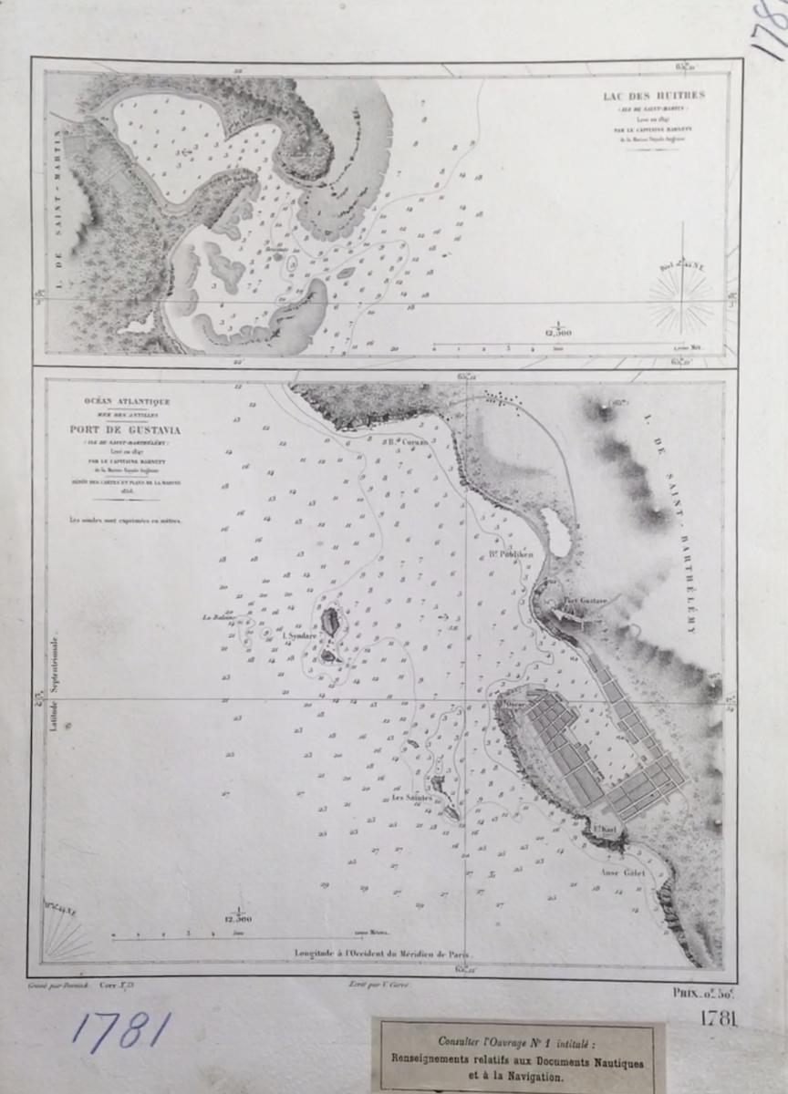 Sjökort, Antilles, Västindien, 1858. På franska 'Lac des Huitres, Port de Gustavia'