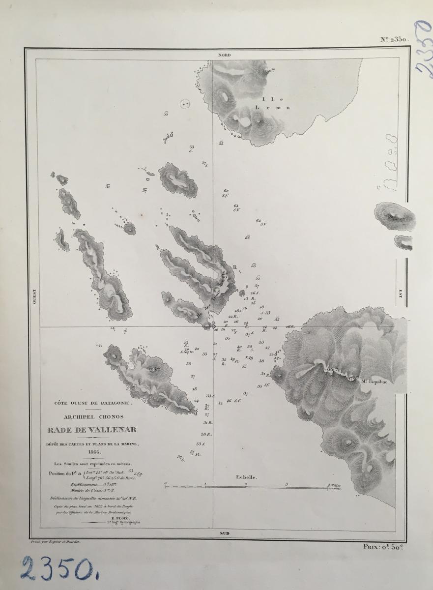 Sjökort, Patagonien, 1866. På franska ' Archipel Chonos, Rade de Vallenar'
