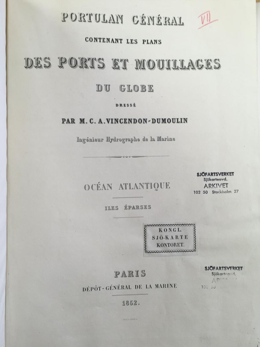 Sjöatlas, 1852. Stilla Havet. Bok med kartor från hela världen. På franska 'Des Ports et Mouillages du Globe' och 'Ocean Atlantique iles eparses'
