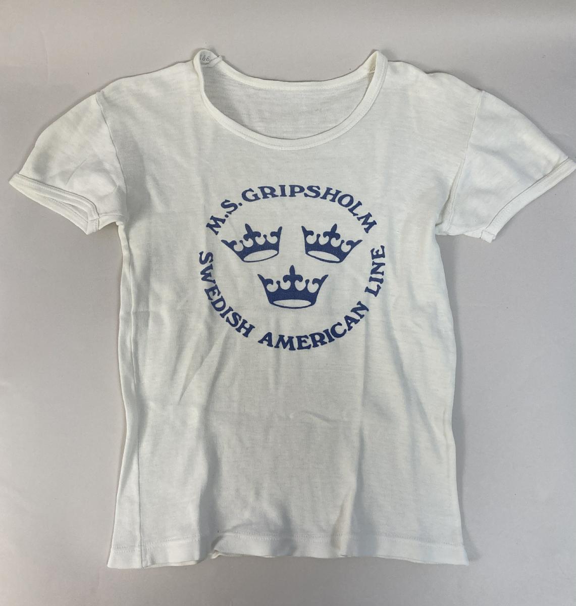 T-shirt från Svenska Amerika Linien. På framsidan ett tryck med fartygsnamnet GRIPSHOLM. T-shirten har tillhört Eva Thormählen som arbetade på GRIPSHOLM 1974-75. Den köptes av henne i butiken ombord GRIPSHOLM.