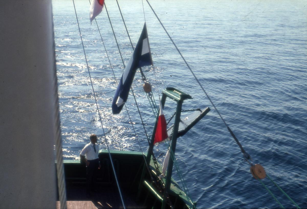 Trålaren RED SNAPPER i augusti 1968, sannolikt på provtur från Sölvesborgs varv. Bilden är tagen ombord mot fartygets akter och i den syns detaljer ombord och vattnet bakom.