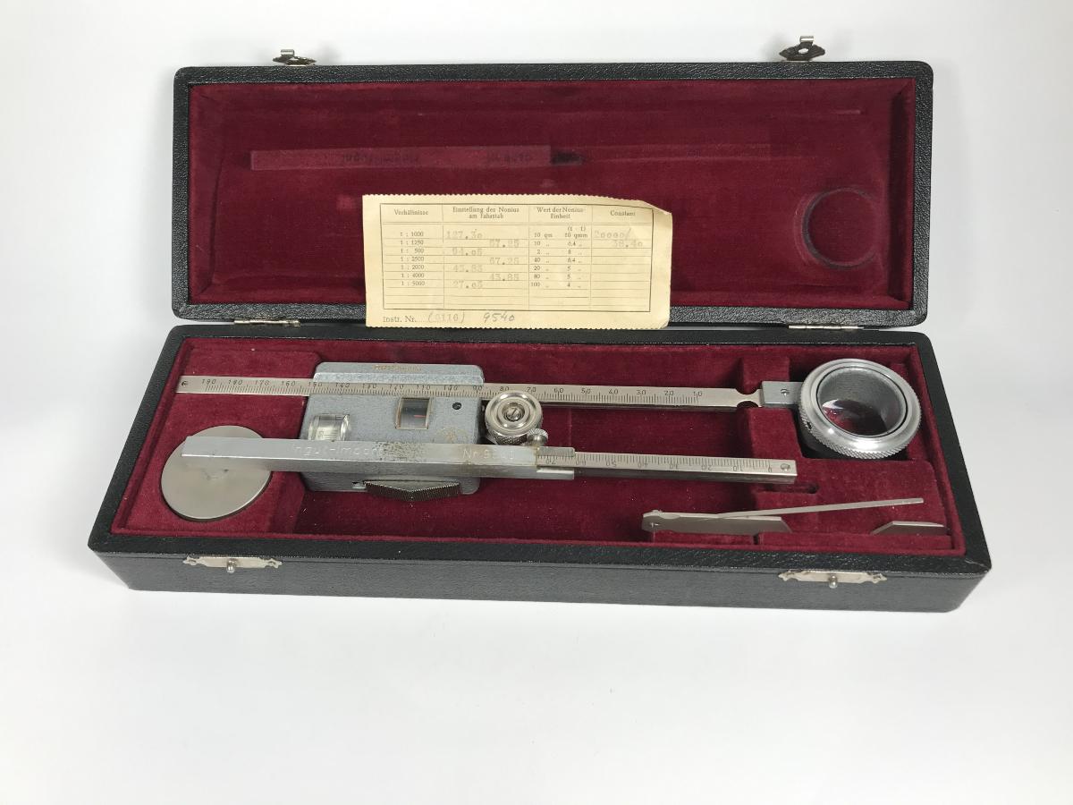 Ett instrument i låda. En planimeter (ytmätare, av latinets planum = yta och grekiska metron = mått) är ett mekaniskt redskap för att mäta ett områdes ytinnehåll på en ritning, karta eller diagram genom att följa dess omkrets. Planimetern består av ett system av stänger, rullar och två stift. Om det ena stiftet förs längs områdets omkrets, rör sig det andra stiftet samtidigt längs en cirkelbåge eller en annan linje, vars längd är proportionell mot områdets area.