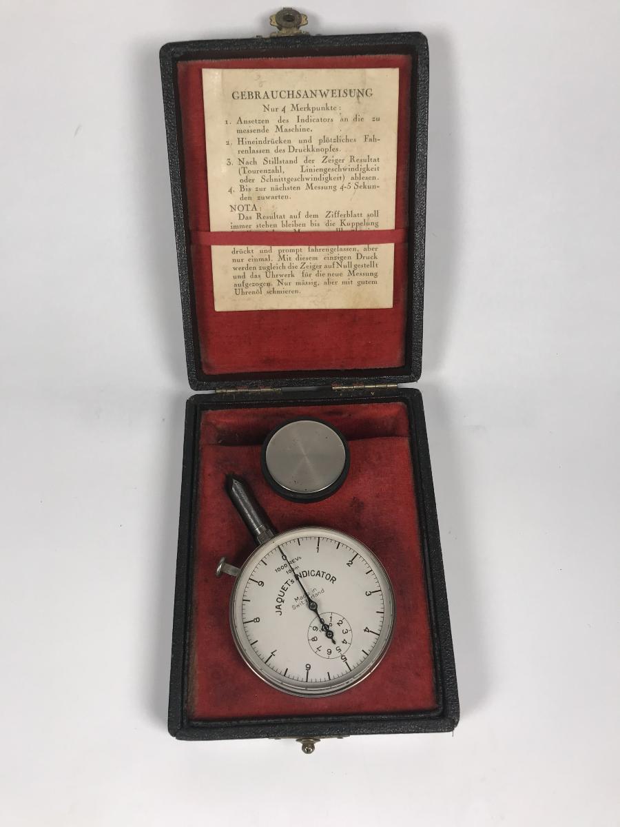 En låda innehållande en analog tachometerklocka. En Tachometer används för att mäta varvtal på roterande föremål tex en motors svänghjul eller annan maskindel. Vid användandet av en analog tachometer håller man tachometerns mätdel mot den roterande mätpunkten och varvtalet överförs och visas på på tachometerns visartavla.