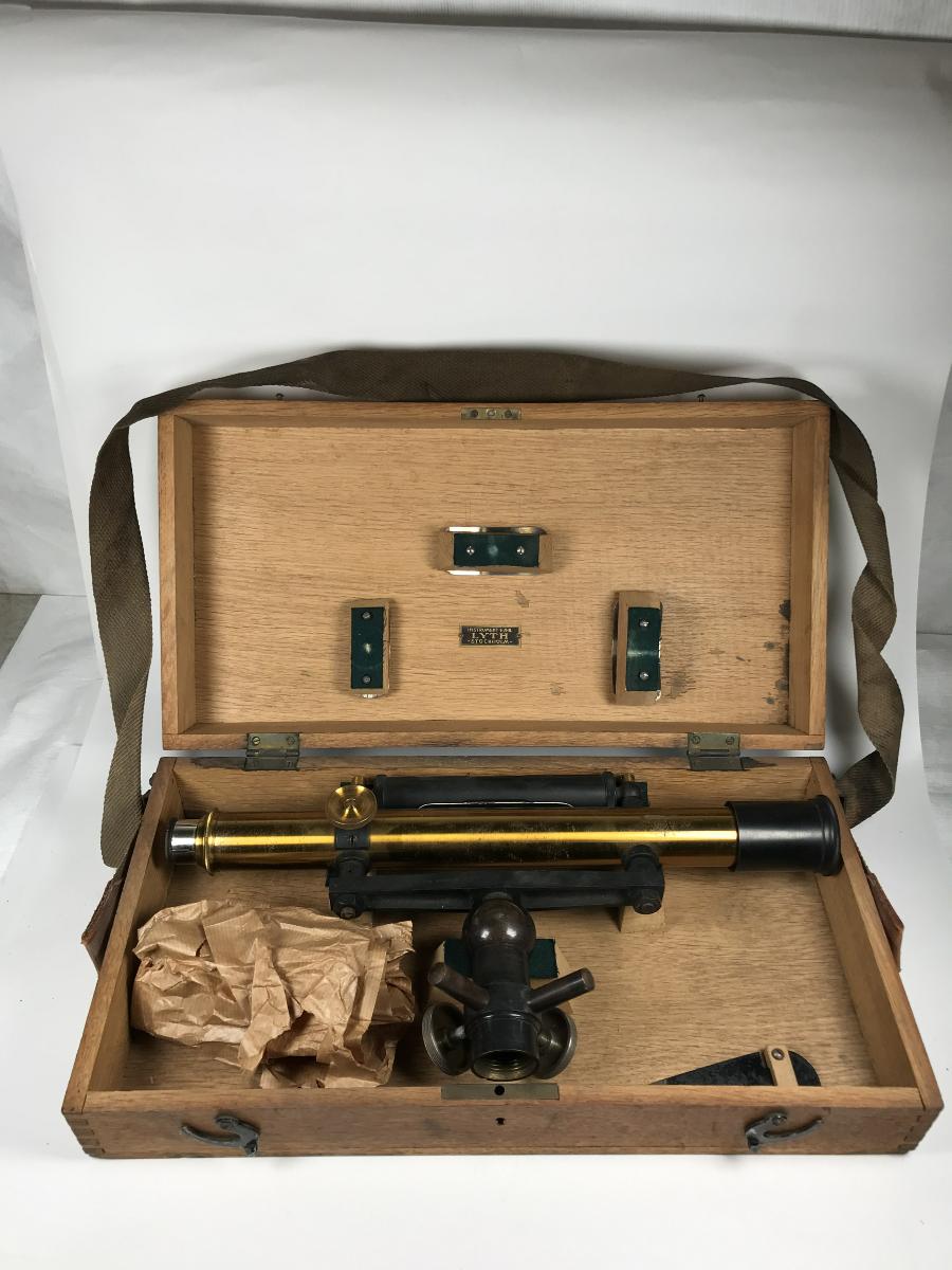 Avvägningsinstrument med tillbehör. Distanstub i polerad mässing, övriga detaljer i svarteloxerad metall. Förvaringslåda i ek med sinkade hörn. Lådan har en bärrem av smärting med läderdetaljer. På insidan av locket finns fjäderbelastade distansklossar för att hålla instrumentet på plats.