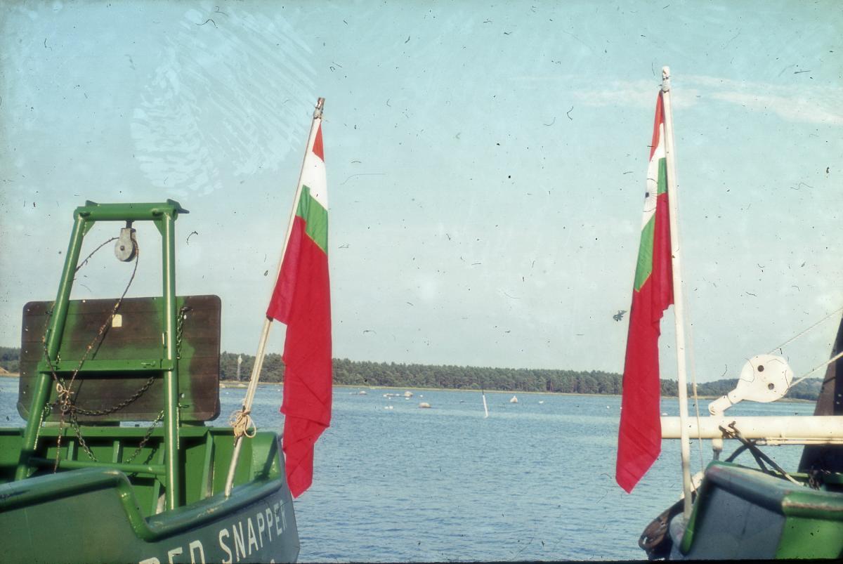 Havsvy med del av trålaren RED SNAPPER i förgrunden, i augusti 1968, sannolikt i Sölvesborg.