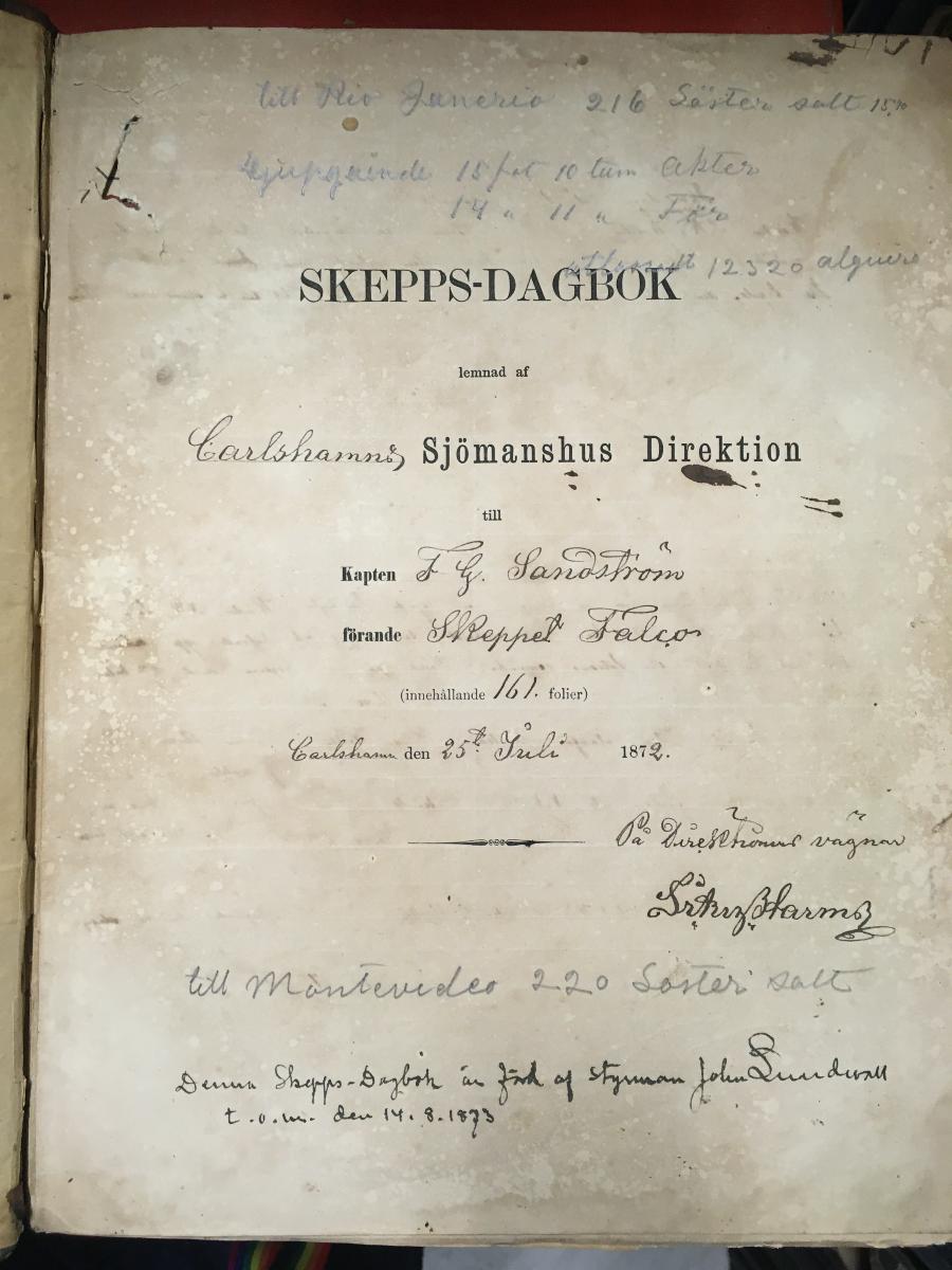 Boken som förts av styrman John Sundvall (Lundvall?) är förd till och med 8 mars 1874.