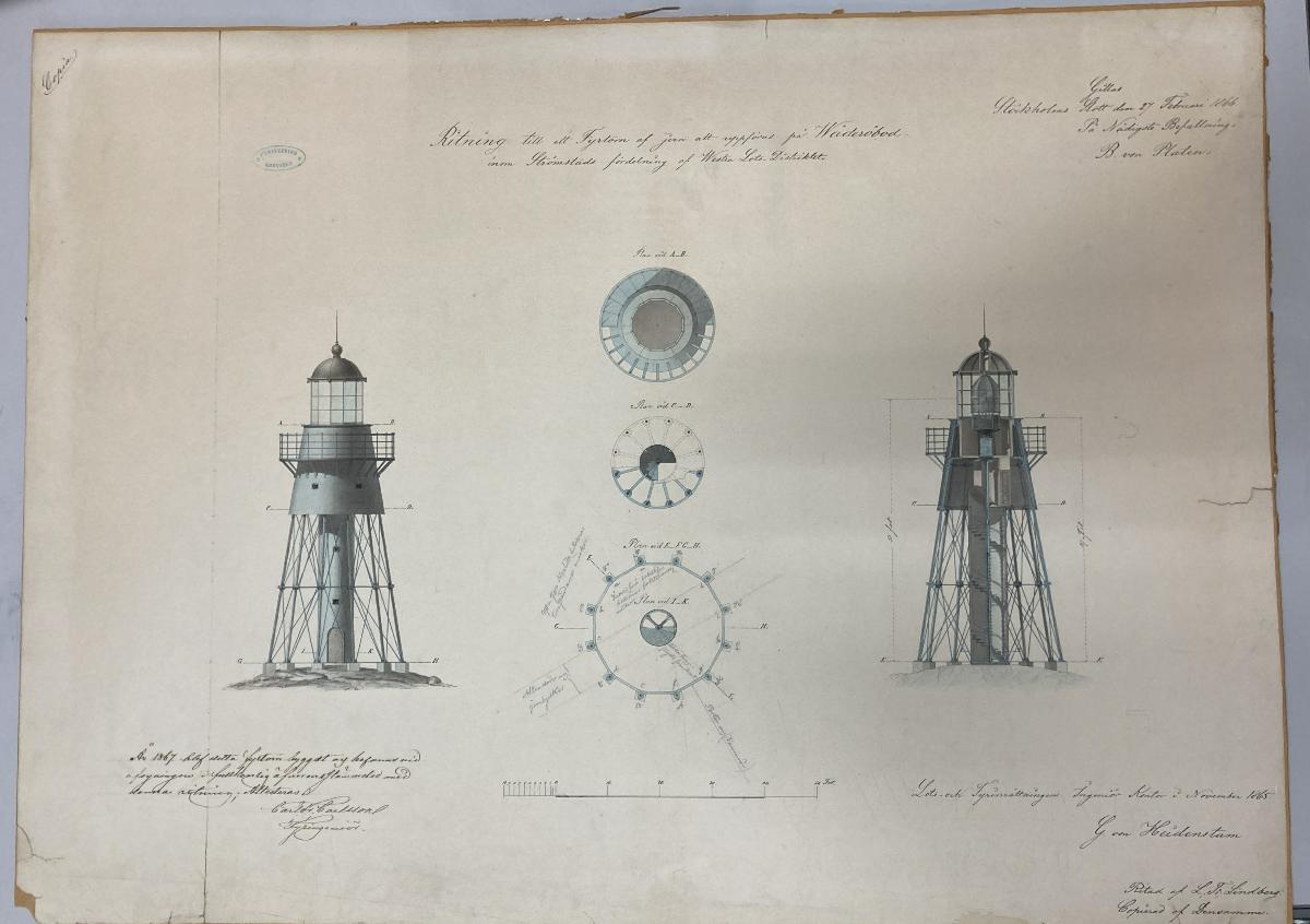Ritning till ett fyrtorn av järn planerat att uppföras på Väderöbod inom Strömstads avdelning av Västra Lotsdistriktet. Daterad till november 1865 och underskriven av fyrkonstruktören Gustaf von Heidenstam. Ritningen är också angiven som ritad av Lars Fredrik Lindberg.