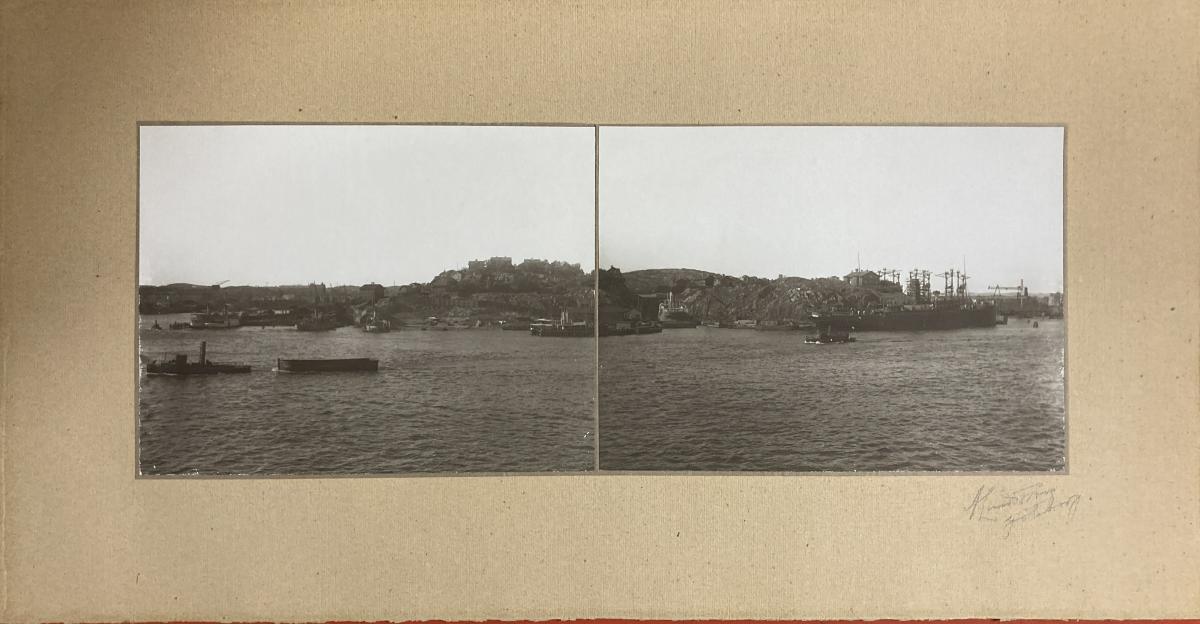 Fotografi av Norra Älvstranden under perioden 1914-1930. På bilden syns bland annat Sannegårdshamnen (ny 1914), Lundby mekaniska verkstad (brann 1930), Slottsberget, Lindholmens torrdocka och Lindholmens varv samt Skatberget.