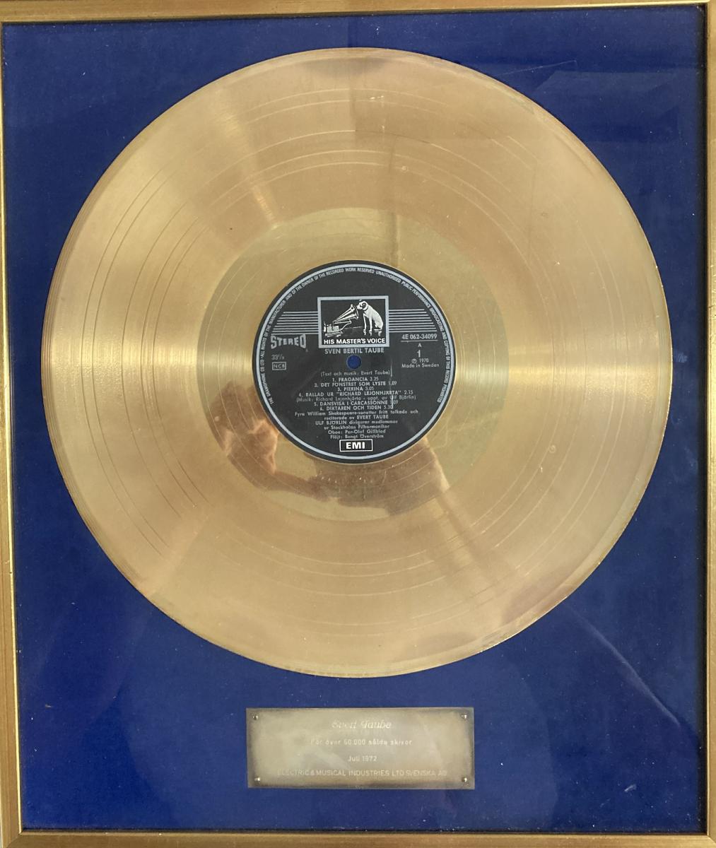 Gå tillbaka till sökLägg till i Min samlingKopiera länkSkriv utEvert Taubes guldskivaAktörerAxel Evert Taube (1890 - 1976), Brukare Astri Taube (1898 - 1980), BrukareKategoriMusik och dans plakett (Utmärkelse)DateringTillverkningsår juli 1972GeografiAvbildad plats: Bohuslän (Europa, Sverige)InventarienummerSMG48984UtställdInte utställd på museetBeskrivningGuldskiva från skivbolaget EMI för 50 000 sålda skivor