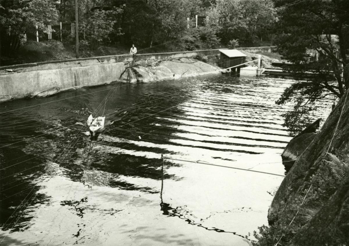 Testränna utomhus i försöksanläggningen, farkost i vattnet. Bild från Chalmers Tekniska Högskolas försöksanläggning för skeppshydrodynamik i Långedrag.