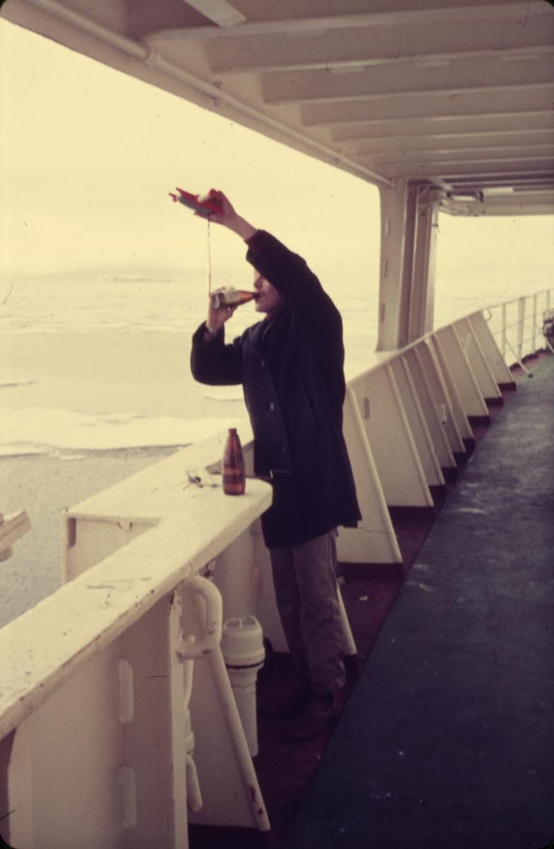 Besättningsman dricker på TROJALANDs däck