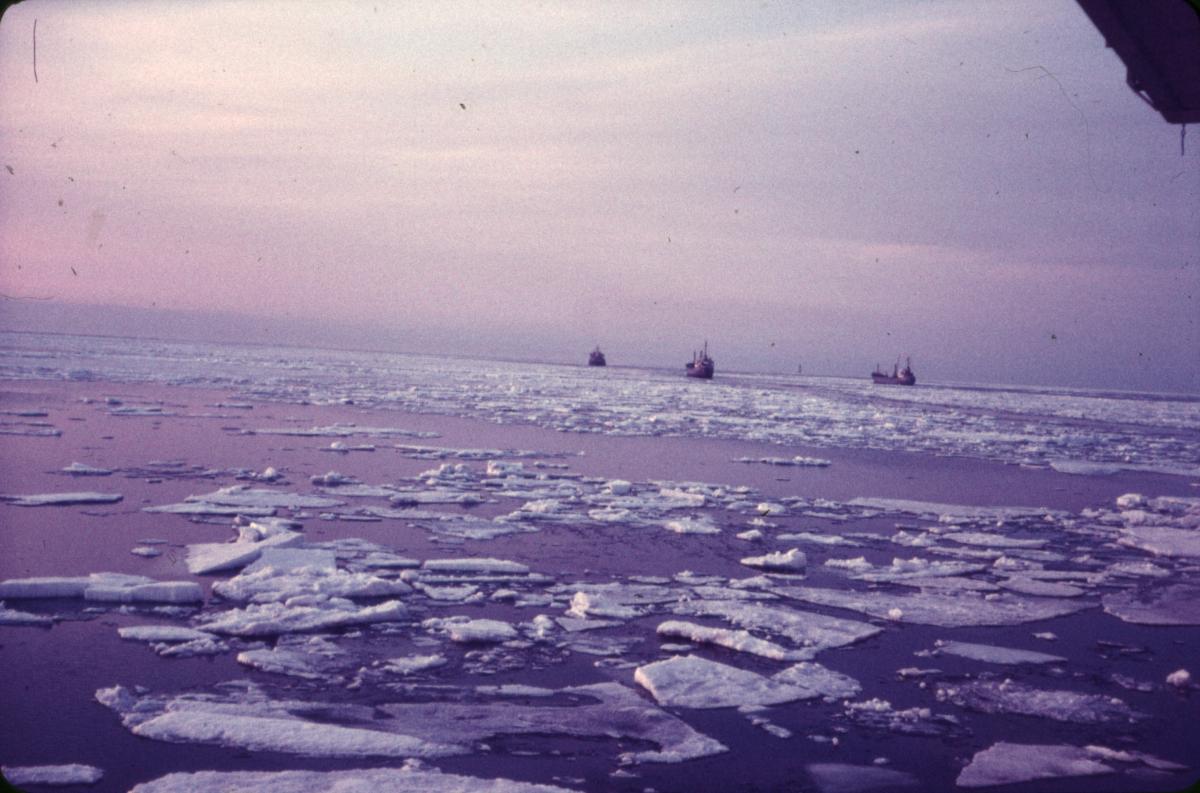 Bild tagen från TROJALAND med utsikt över öppet vatten med mycket is. I bakgrunden tre andra fartyg.