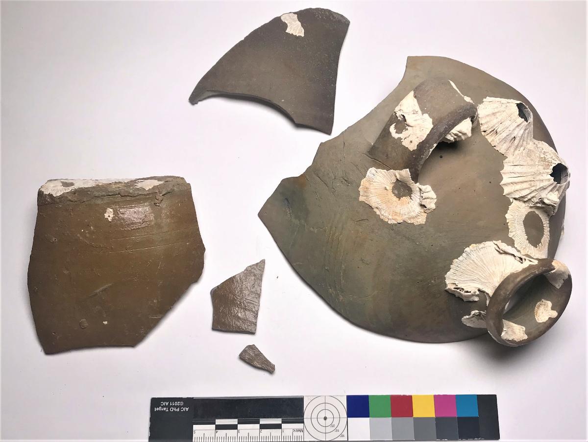 Trolig kärlenhet. Botten/buk till större förvaringskärl. Invändig glasyr. Utvändiga rillor. Mindre skärvan troligen från skuldra/hals med plastisk vågdekor.