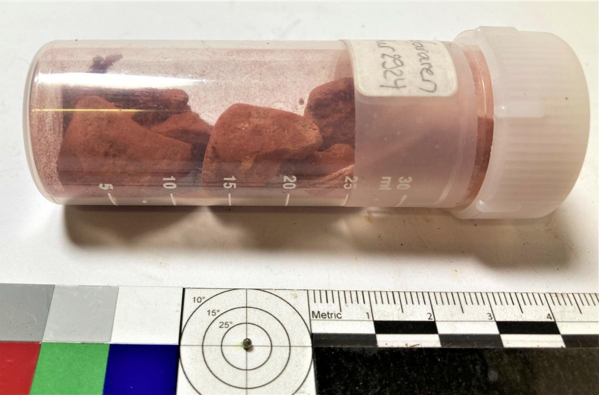 Pigmentet är från vraket av ostindiefararen Götheborg, som gjorde tre resor till Kina 1739-45. Vid hemkomsten från den sista resan 12 september 1745 förliste fartyget vid grundet Hunnebådan strax utanför Nya Elfsborgs fästning. Vid flera tillfällen har material tagits upp från vraket. Föremålet kommer från de marinarkeologiska utgrävningarna på platsen 1986-1992.