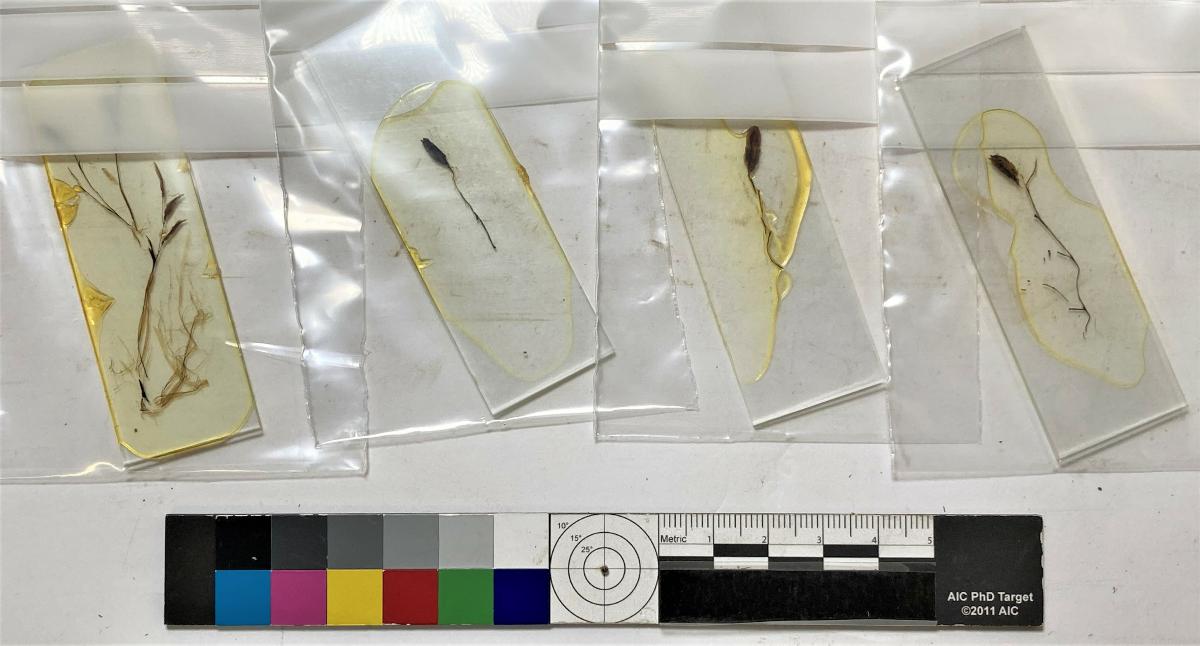 Fyra preparat inglasat i objektglas, ris.
