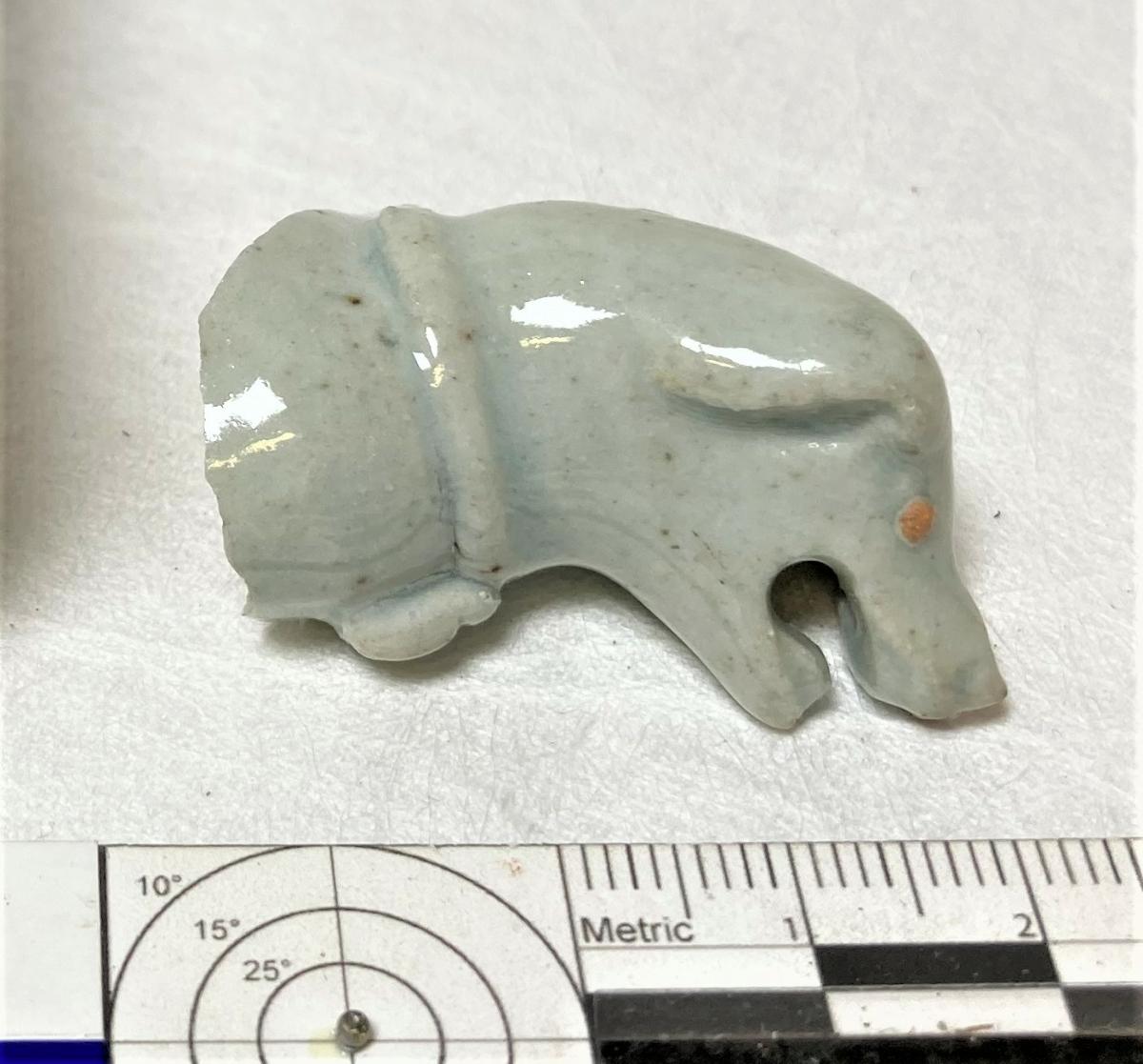 Hundar i ljus turkosblå glasyr på ovansidan, oglaserad på undersidan, liggande med höger ben under kroppen, skarabé i ett band runt halsen.