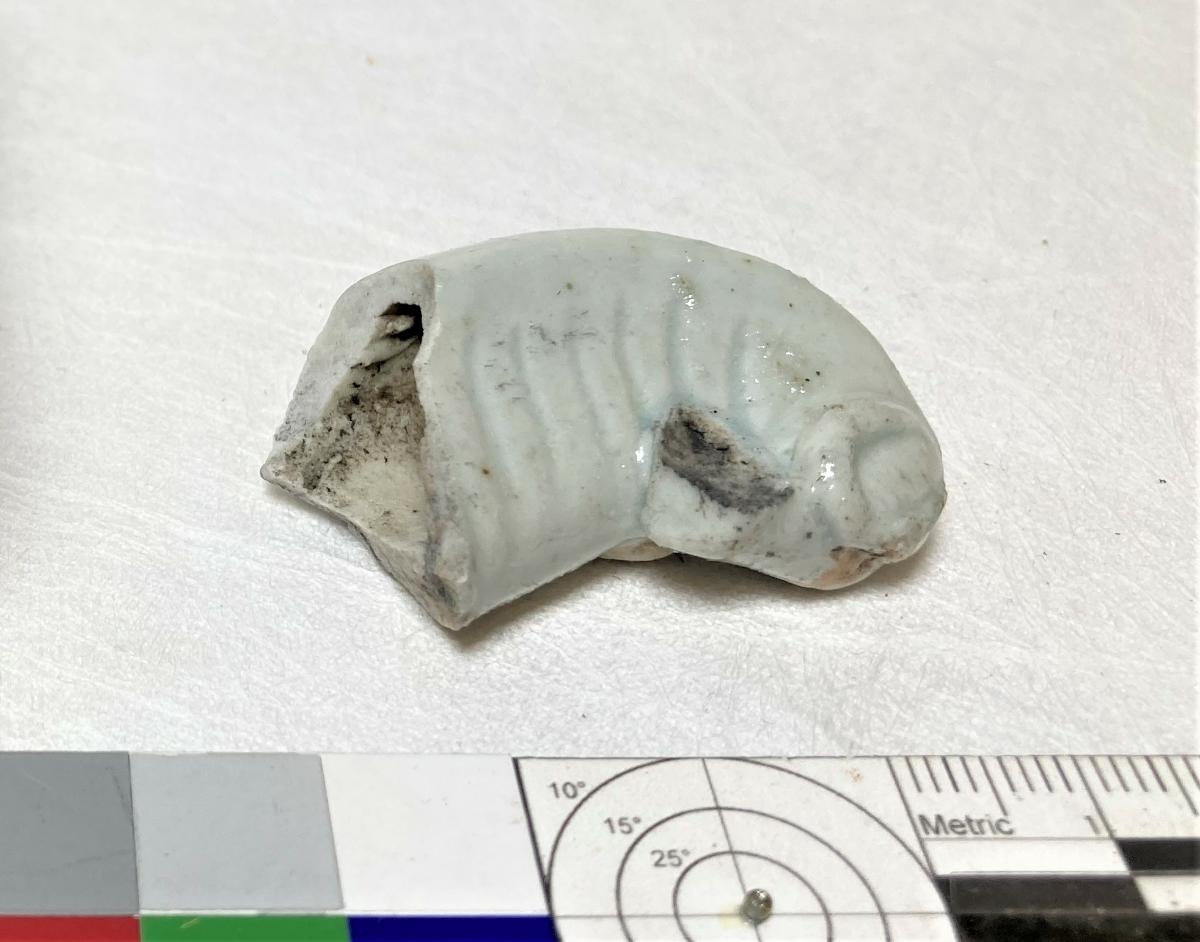 Hundar i ljus turkosblå glasyr på ovansidan, oglaserad på undersidan, liggande med höger ben under kroppen, skarabé i ett band runt halsen.