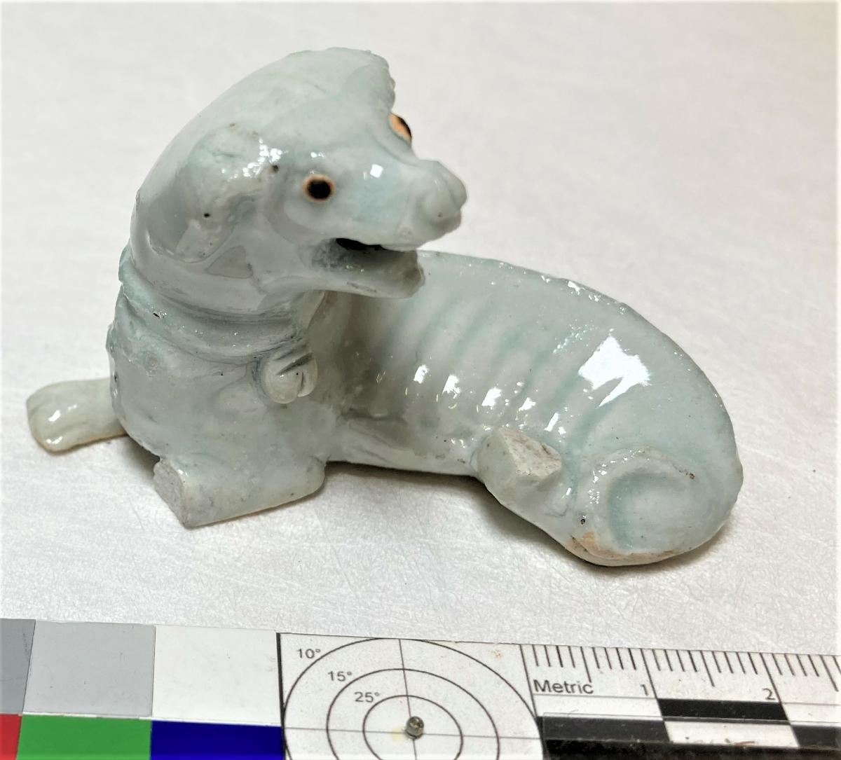 Hundar i ljus turkosblå glasyr på ovansidan, oglaserad på undersidan, liggande med höger ben under kroppen, skarabé i ett band runt halsen. Huvudet vridet åt vänster. V. Bak- och framben avbrutna.