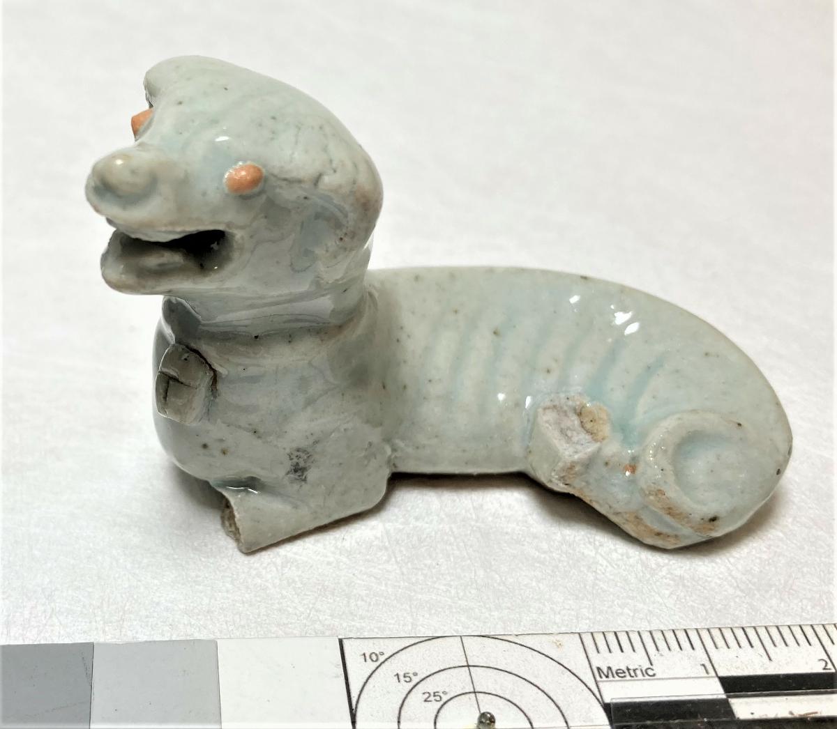 Hundar i ljus turkosblå glasyr på ovansidan, oglaserad på undersidan, liggande med höger bakben under kroppen, skarabé i ett band runt halsen.