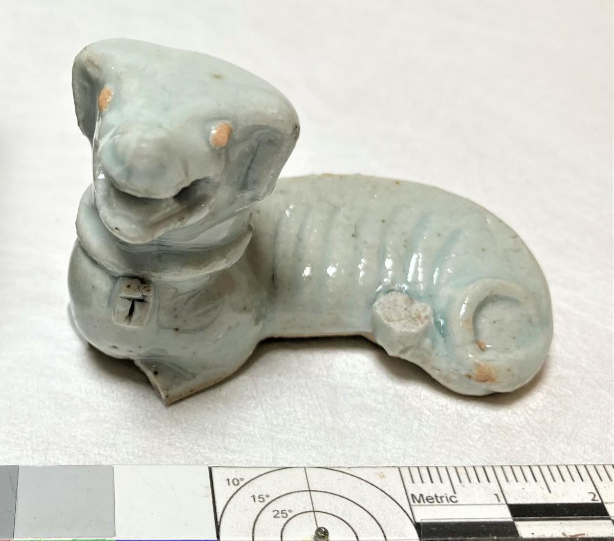 Hundar i ljus turkosblå glasyr på ovansidan, oglaserad på undersidan, liggande med höger bakben under kroppen, skarabé i ett band runt halsen.