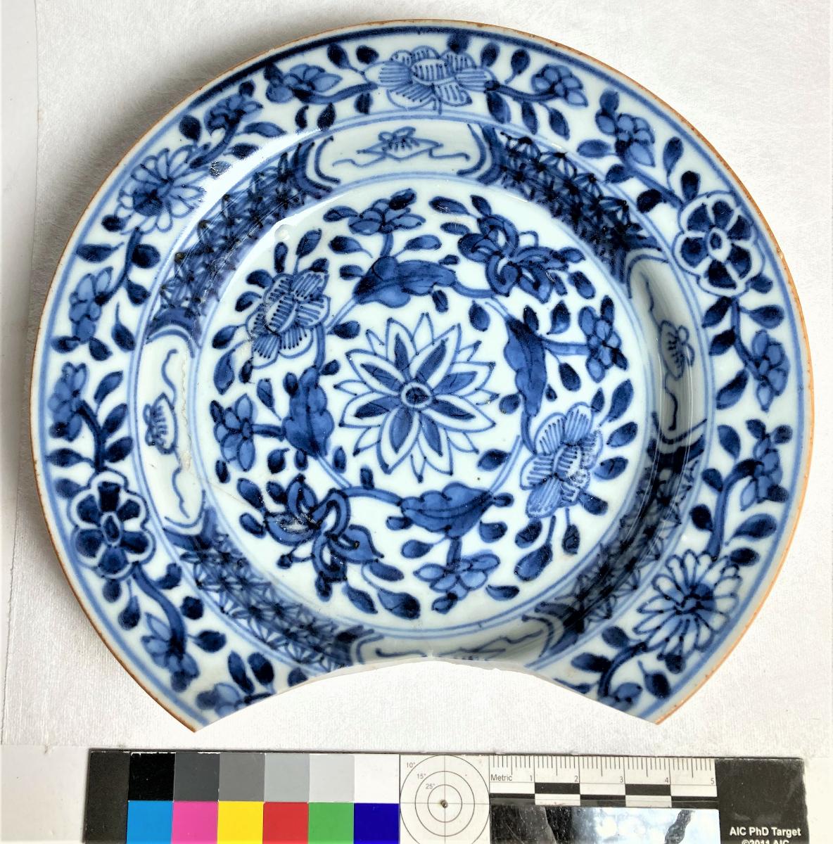 Kategori A; Underglasyrblå dekor. Motiv; "de hundra antikviteterna". Dekor även på undersidan brättet. Lätt repig i botten.