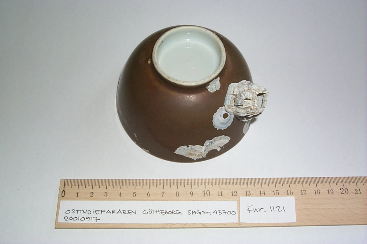 Kategori D: Brun glasyr på utsidan och emaljfärgsdekor på insidan eller brun glasyr med ursparningar som dekorerats med emaljfärger. Fin spricka, beväxt med havstulpaner på utsidan.