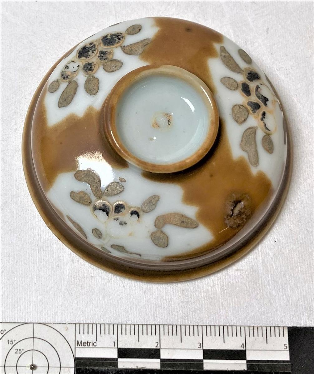 Lock till burk. Välvt med skålformat "handtag" i mitten på ovansidan, oglaserad kant, på undersidan, för passning i burken. Kategori D; brun glasyr med tre ursparningar i form av löv, som dekorerats med emaljfärger. Emaljfärgerna är lösa och känsliga och har mestadels fallit av, de som är kvar är svarta i färgen.
