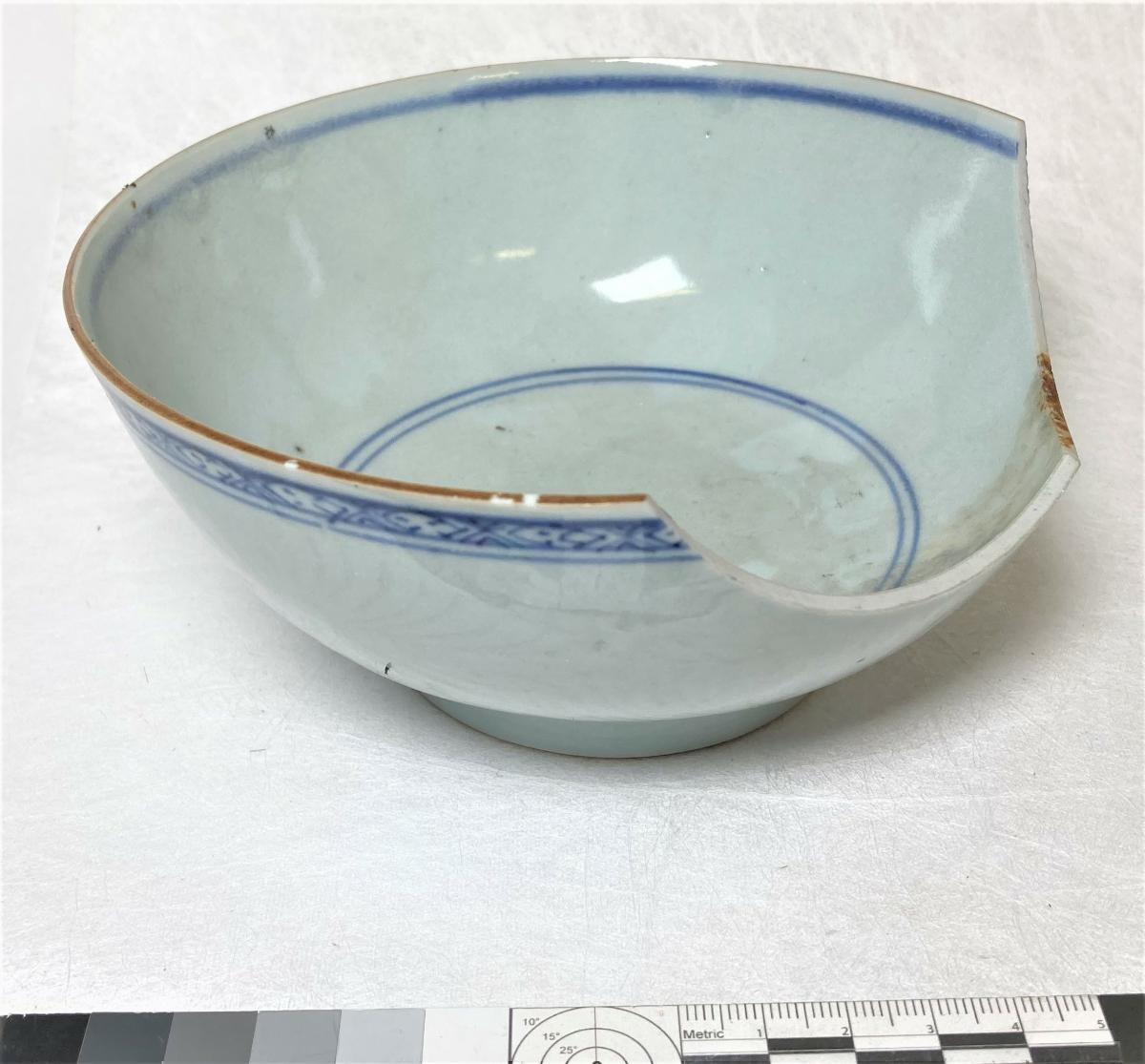 Skål, underglasyrblå dekor, blomma i botten och ränder på insidan, kanter och band på utsidan. Stor skärva saknas.