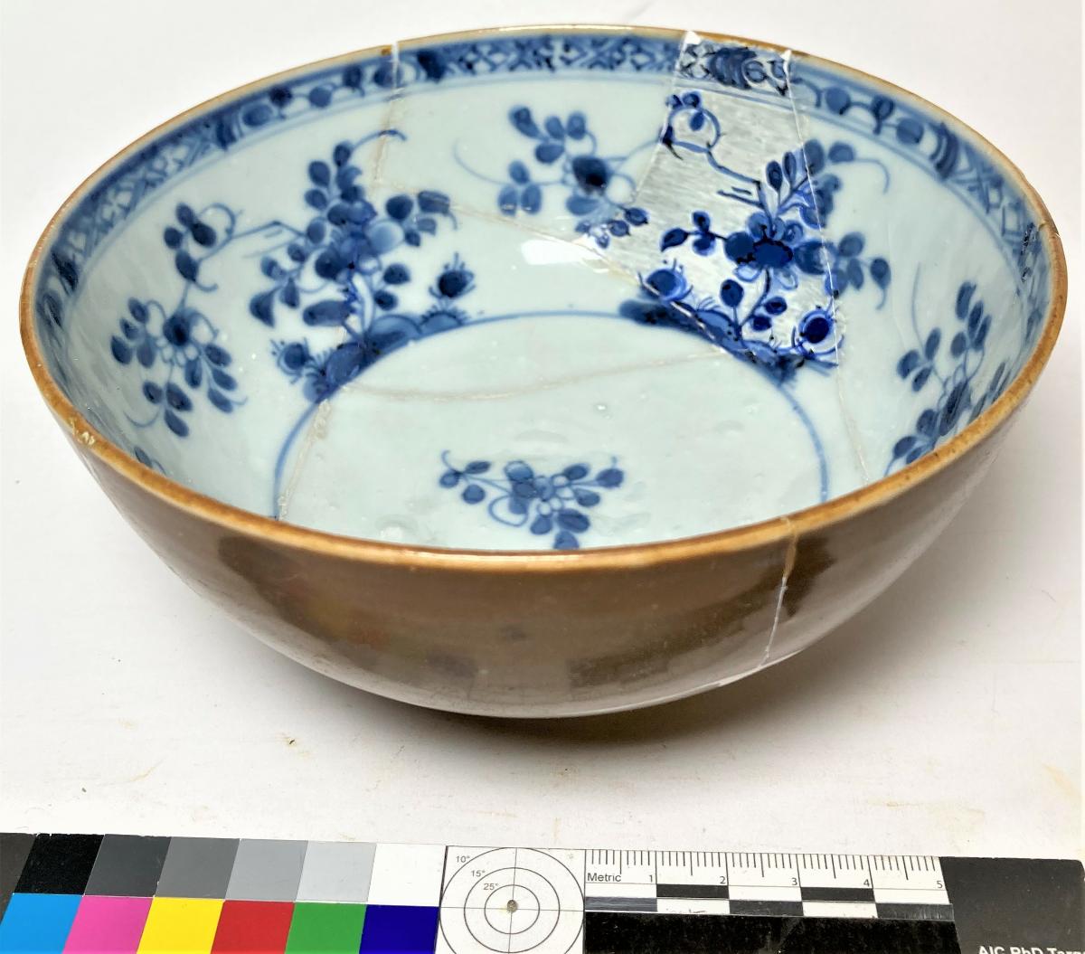 Skålen är limmad och ett hålrum, efter en skärva som saknas, har fyllts ut med gips.