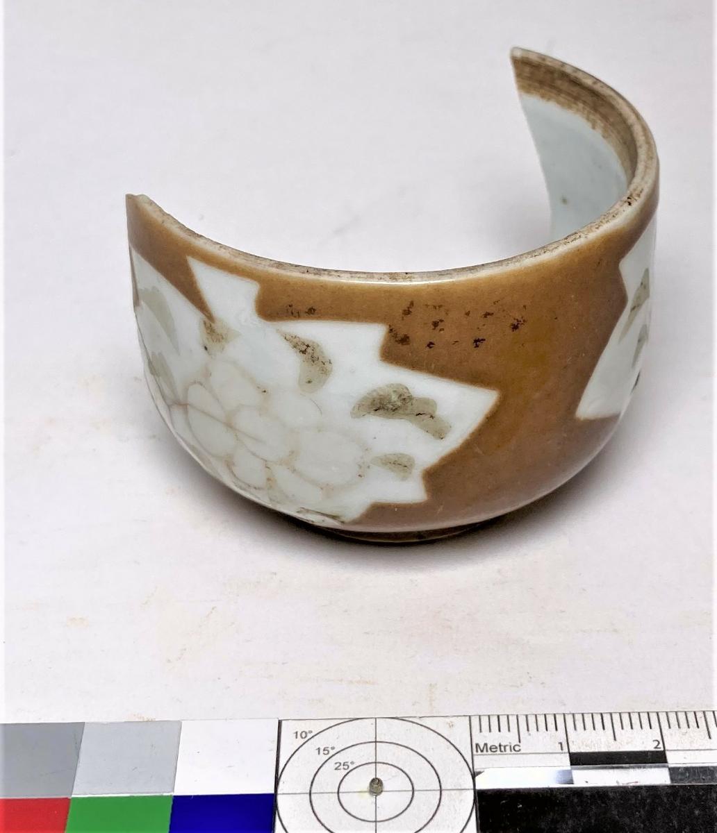 Burk, del av. Kategori D; brun glasyr med tre ursparningar i form av löv, som dekorerats med emaljfärger. Emaljfärgerna är lösa och känsliga och har mestadels fallit av, de som är kvar är svarta i färgen.