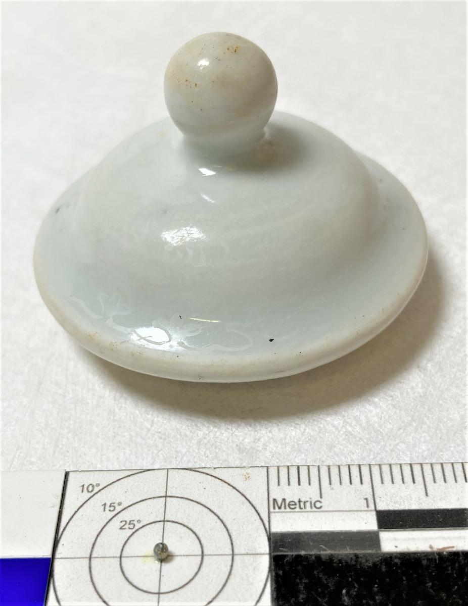 Lock till burk. Vitglaserat gods. Välvt med knopp i mitten på ovansidan. Oglaserad kant på undersidan, för passning i burk.
