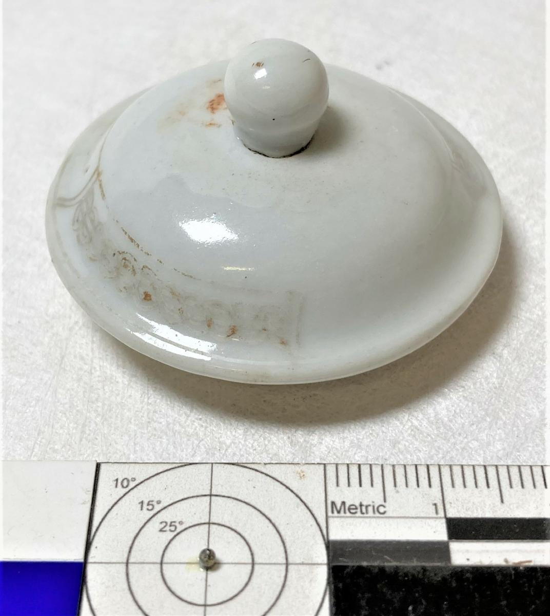Lock till burk. Vitglaserat gods. Välvt med knopp i mitten på ovansidan. Oglaserad kant på undersidan, för passning i burk.