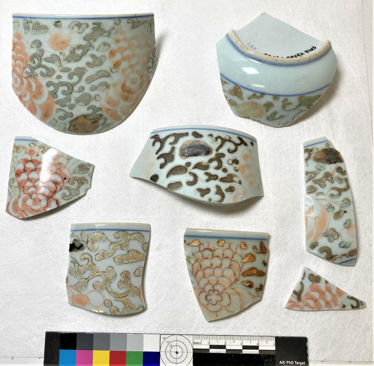 8 skärvor av koppar och 3 skärvor av lock. Vit underglasyr med blå dekor. Emaljfärger målade på utsidan. Ojämn nedbrytning