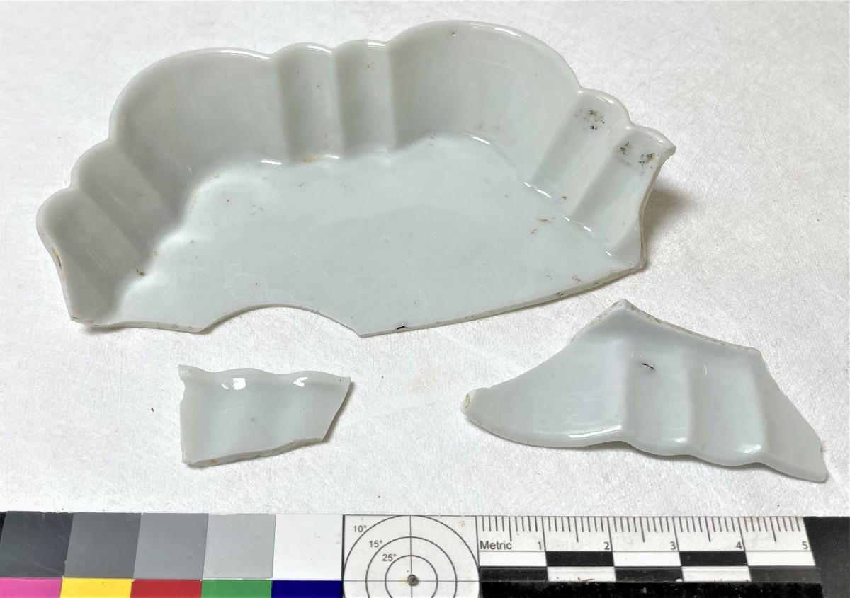 Skärvor till vitglaserat fat med platt botten och en hög vågformad kant.