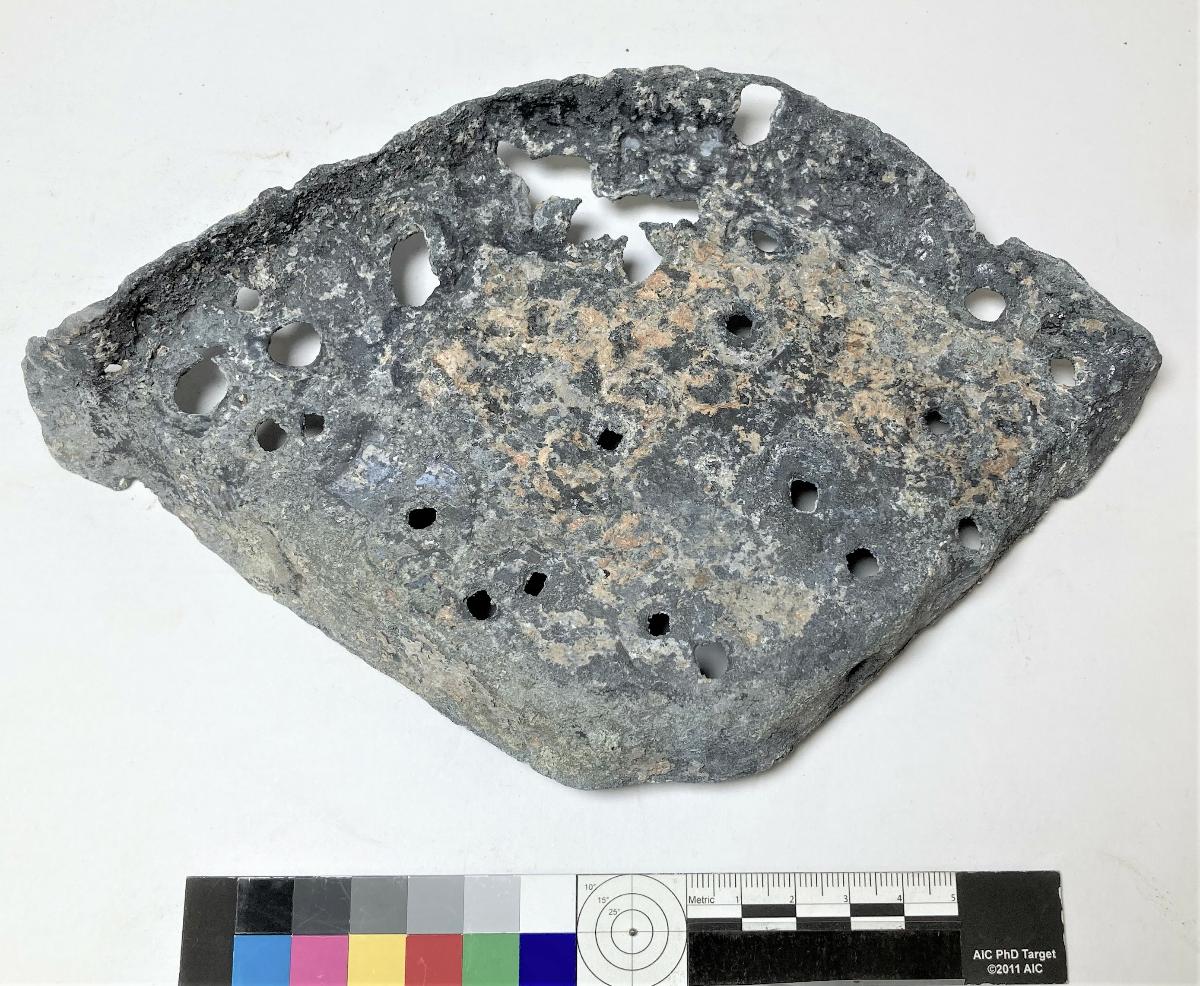 Tjock blyplåt med hål efter spik. Spår efter spikskallar. Rundade kanter är uppböjda åt motsatt håll.