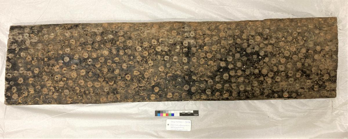 Bordläggningsbrädan bär omfattande rester av drev på ena sidan samt hål efter förhydning på andra sidan.