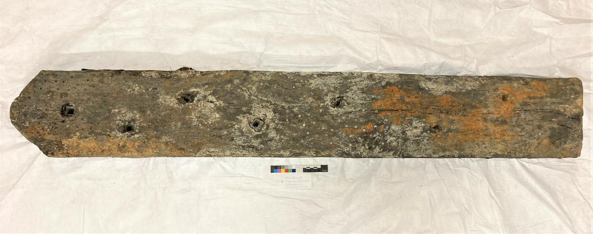 Kraftigt timmer med en avrundad och en rakt avskuren ände. 7 större hål för bultar samt mindre hål från förhydning. Drevrester på timrets kortsida.