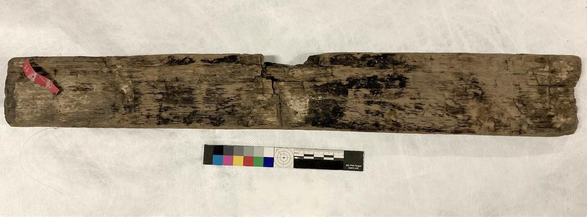 Laggstav med skavd och missfärgad (på insidan) ände samt större skada på mitten.