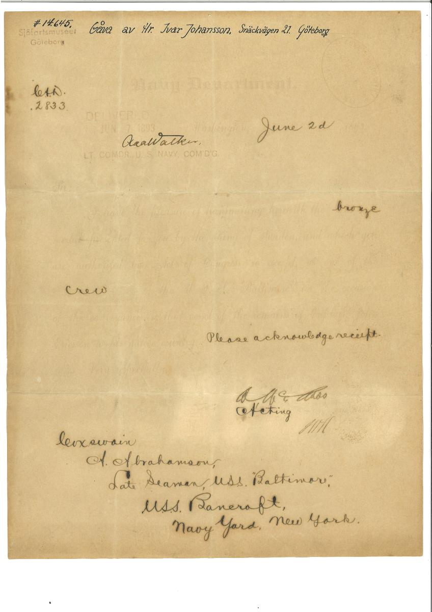 Det medföljande diplomet är i övrigt mycket blekt och svårläst. Det kommer från amerikanska marinen och är stämplat på baksidan med: Commandant's office, Navy yard, New York 6 juni 1893.
