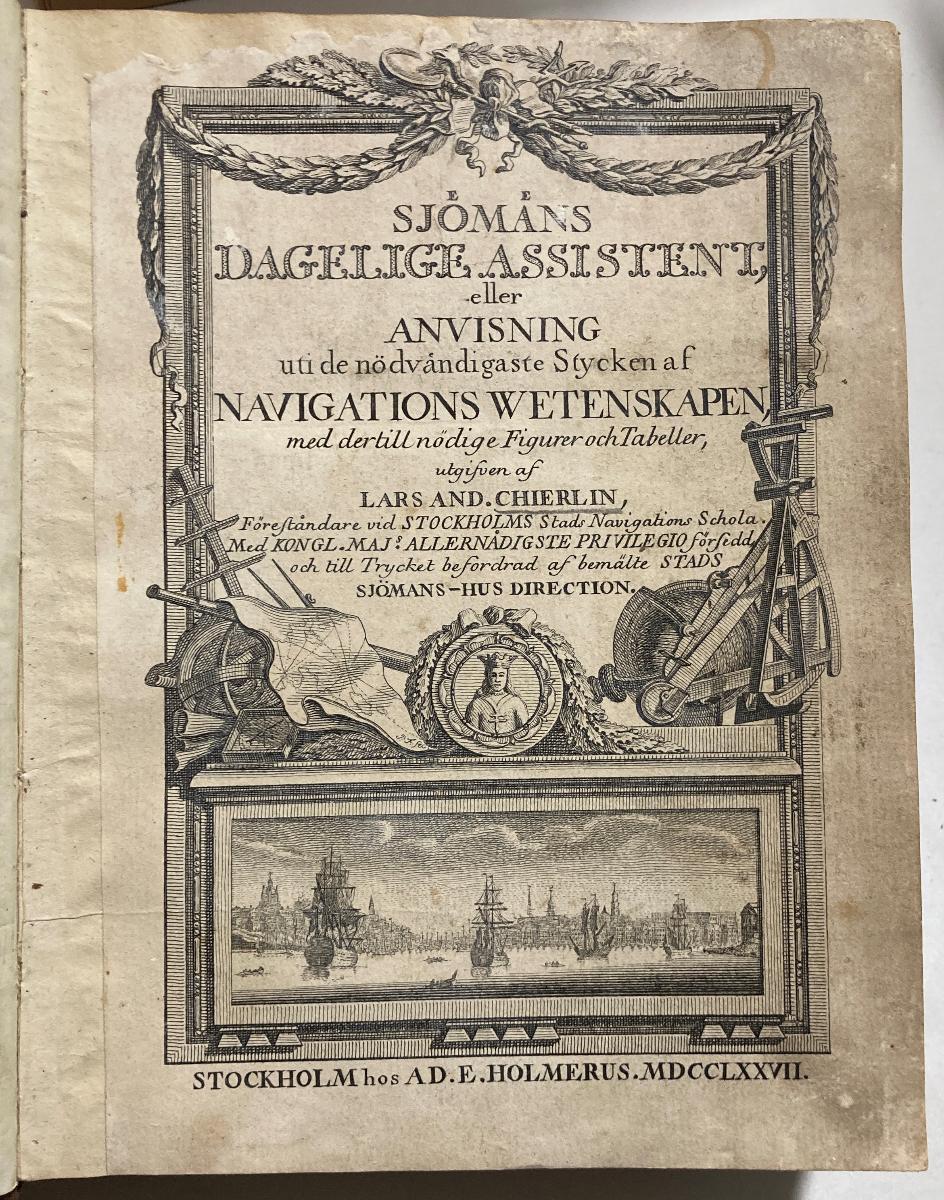 Sjömäns dagelige assistent, eller Anvisning uti de nödvändigaste stycken af navigations wetenskapen, med dertill nödige figurer och tabeller, utgifven af Lars And. Chierlin, föreståndare vid Stockholms stads navigations schola. Med kongl. maj:ts allernådigste privilegio försedd, och till trycket befordrad af bemälte stads sjömans- hus direction. Stockholm hos Ad. E. Holmerus. MDCCLXXVII