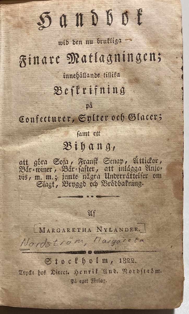 Handbok wid den nu brukliga finare matlagningen; innehållande tillika beskrifning på confecturer, sylter och glacer; samt ett bihang, att göra soja, fransk senap, ättickor, bär-winer, bär-safter, att inlägga anjovis, m.m.; jemte några : underrättelser om slagt, bryggd och brödbakning. Af Margaretha Nylander. Stockholm, 1822. Tryckt hos direct. Henrik And. Nordström. På eget förlag.