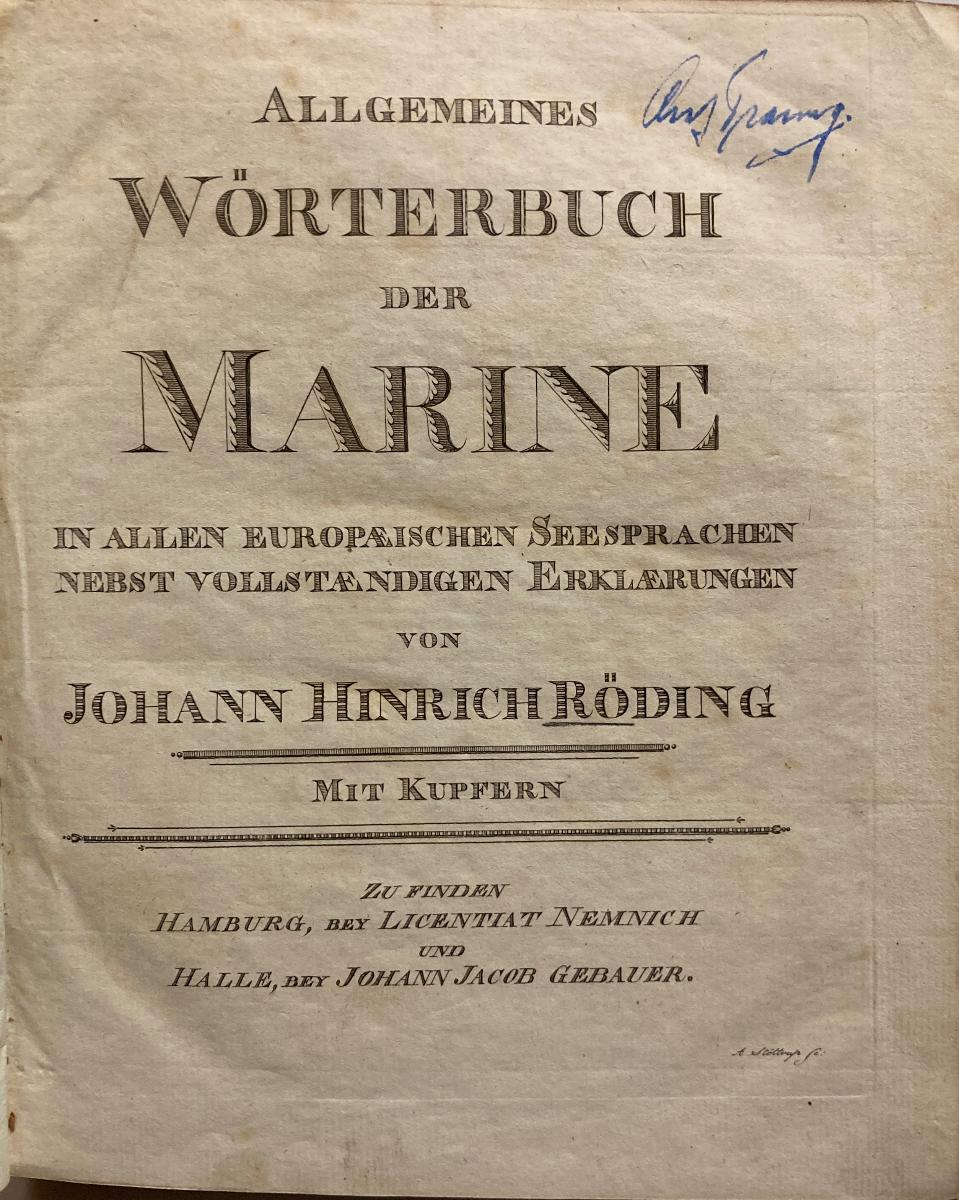 Allgemeines Wörterbuch der Marine. In allen europaeischen Seesprachen nebst vollstaendigen Erklaerungen von Johann Hinrich Röding. Mit Kupfern.